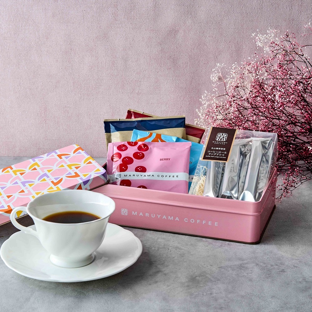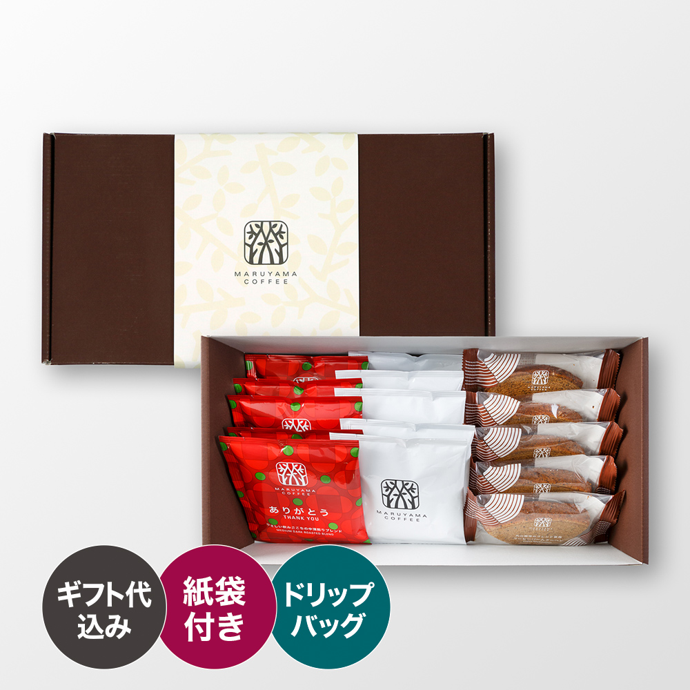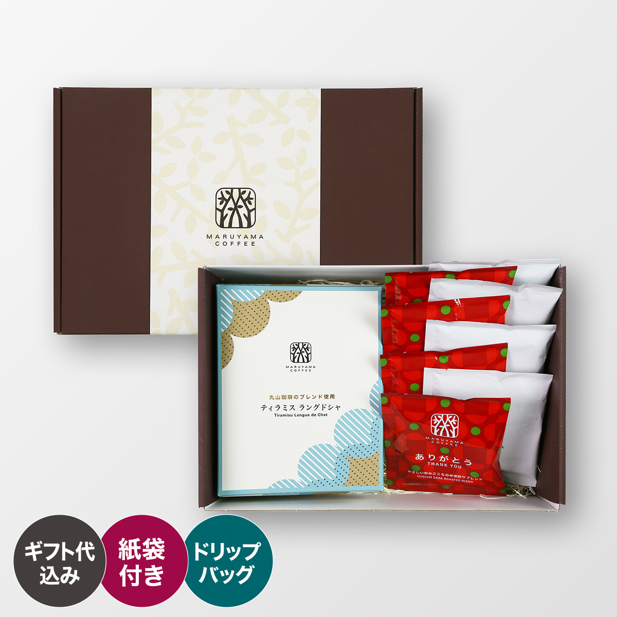 丸山珈琲のオリジナル商品ティラミスラングドシャと、おすすめのドリップバッグを詰め合わせたギフトです。