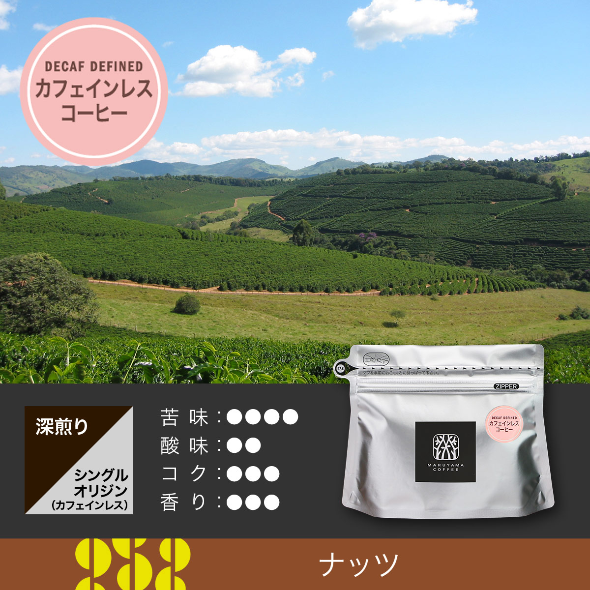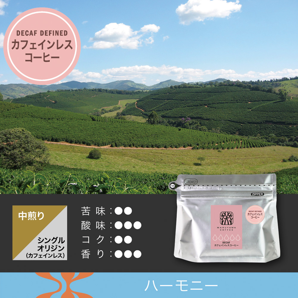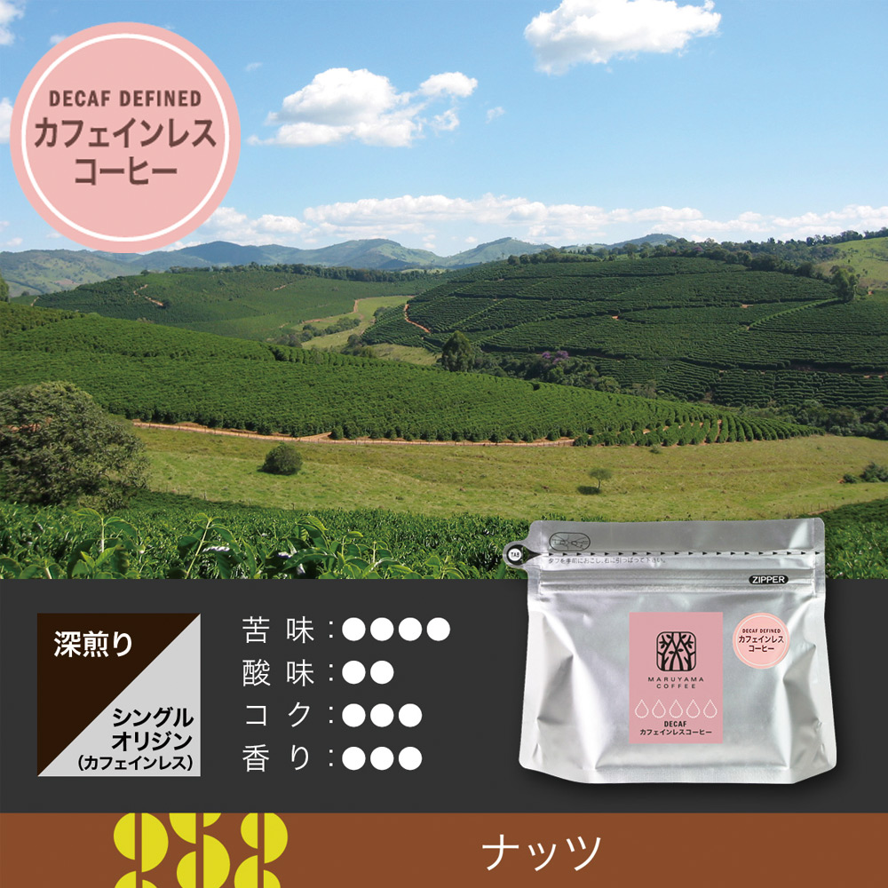 丸山珈琲のカフェインレスは化学薬品を一切使用しない方法で99.9%カフェインを除去したスペシャルティコーヒーを使用しています。