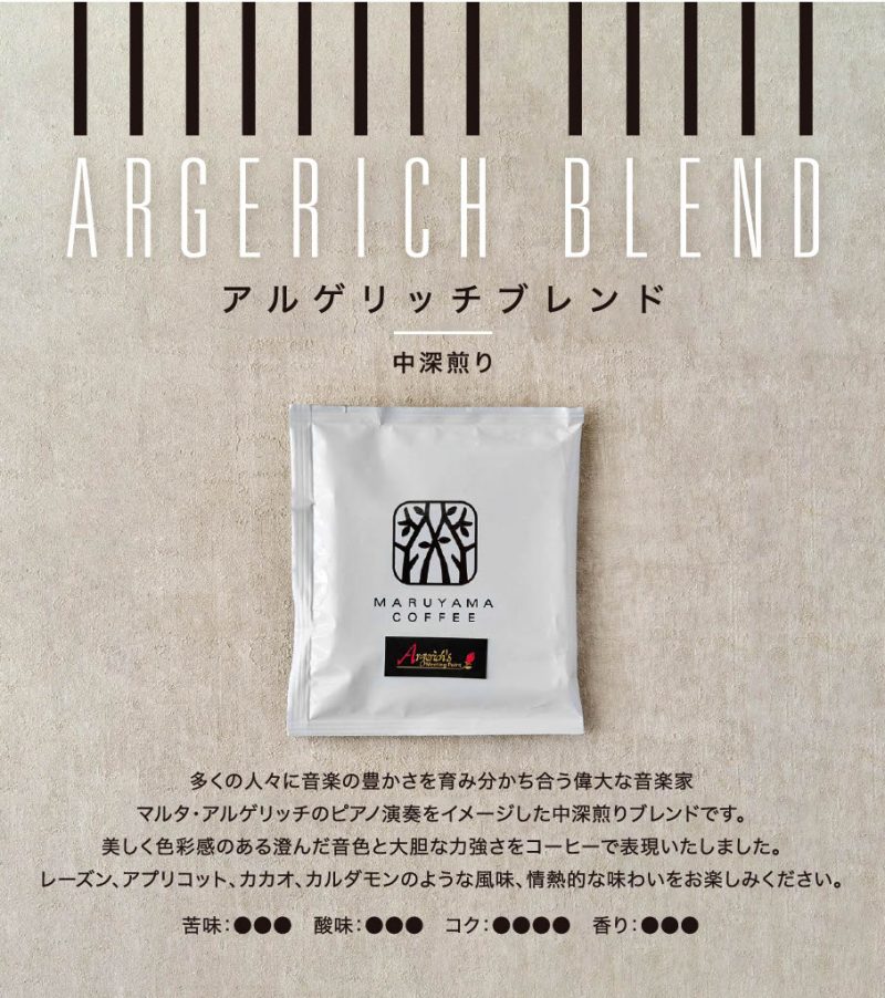 丸山珈琲では、2015年から初夏に開催されている、別府アルゲリッチ音楽祭とコラボレーションをしてオリジナルブレンドを期間限定で販売しています。多くの人々と音楽の豊かさを育み分かち合う、偉⼤な⾳楽家でピアニストでもあるマルタ・アルゲリッチ氏の演奏をコーヒーのブレンドで表現した中深煎りブレンドです。