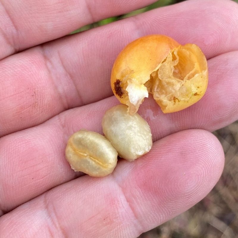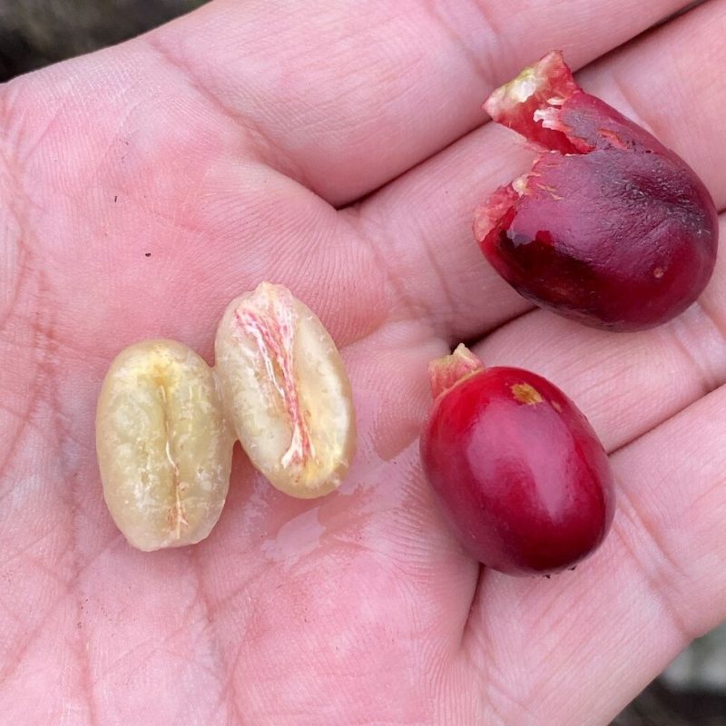 ゆっくりと実が熟すことにより、アグロタケシ農園のコーヒーチェリーはコーヒー豆の生豆を覆う、コーヒーの味わいに影響を与える粘液質のミューシレージとよばれている層の部分がとても厚くなっています。本来は粘液の膜が付いている程度ですが、寒天質のように厚く付着しています。それは、コーヒーチェリーがアンデス山脈最奥地の渓谷である厳しい環境下のもと、ゆっくりと旨味を蓄えて完熟までに時間を要した証拠です。