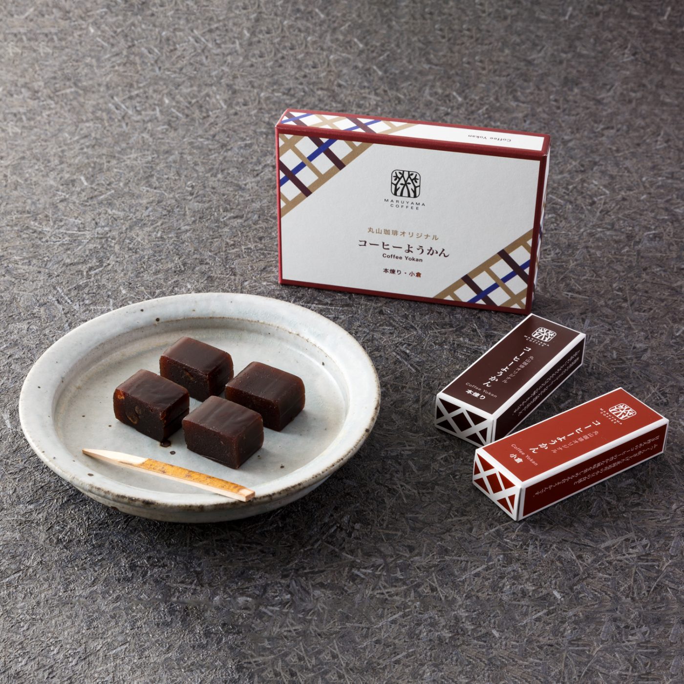 丸山珈琲のコーヒーようかんは、コーヒーと小豆が奏でる、上品な味わいとやさしい口あたりをお楽しみいただけます。日本茶はもちろん、 コーヒーとも相性の良い味わいに仕上げました。