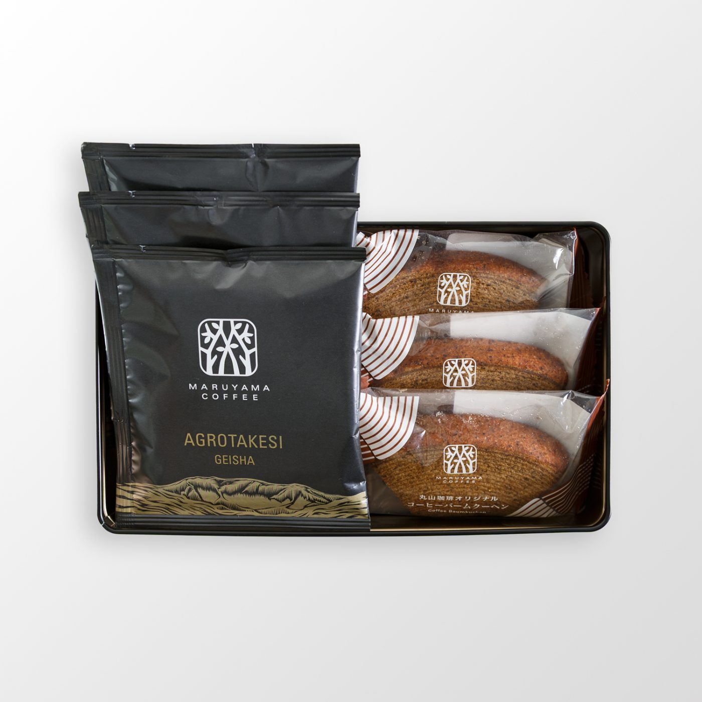 世界最高レベルの高品質コーヒーのアグロタケシ ゲイシャと、上品な甘さとコーヒーの豊かな香りが魅力のバームクーヘンを丸山珈琲のロゴを冠した重厚感ある缶に詰め合わせてご用意いたしました。(ドリップバッグ×3・バームクーヘン×3)
