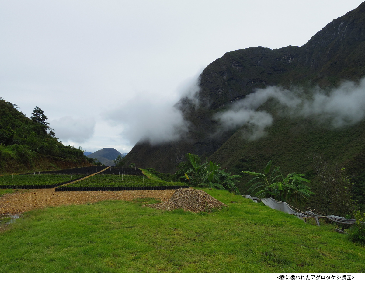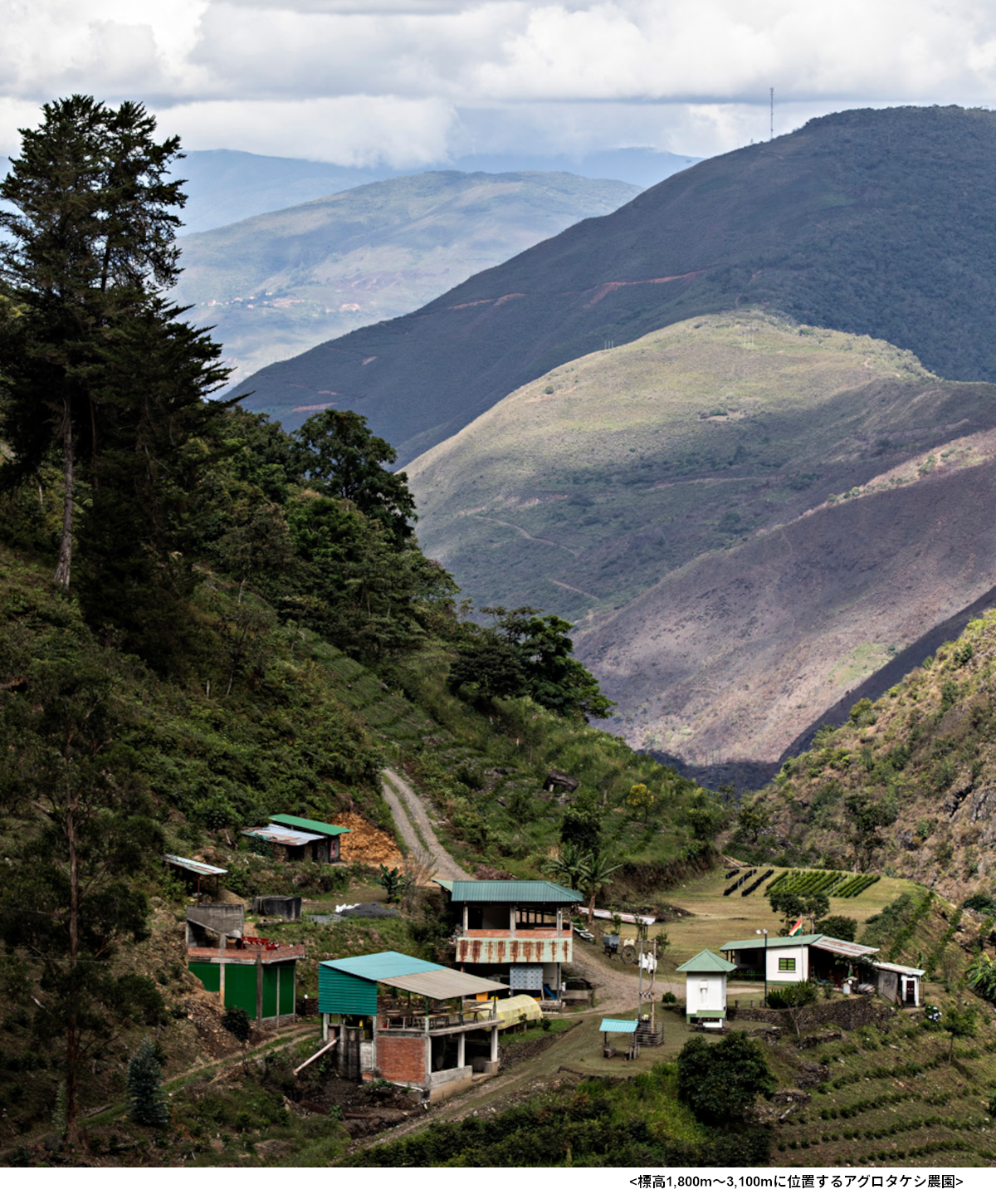 アグロタケシ農園は、標高5,850mのムルラタ山を一望できる、世界でも有数の標高を誇るコーヒー農園です。標高は高い場所ですが、アマゾンからの暖気とアンデスの寒気がちょうどぶつかる渓谷のため、一年中湿度が高く、霧に覆われた雲霧林が広がっています。