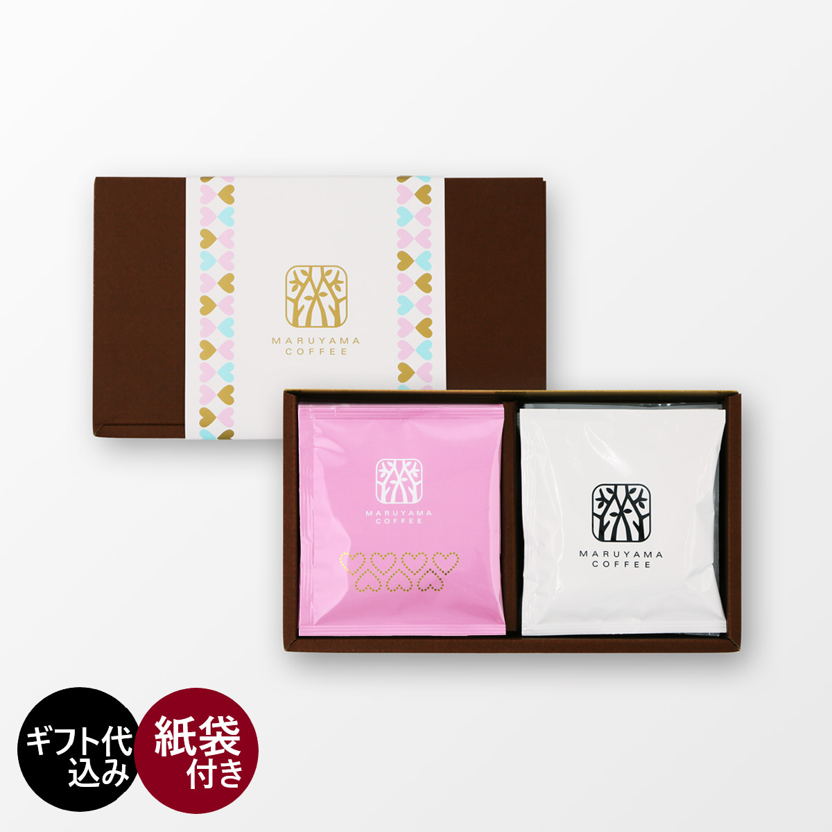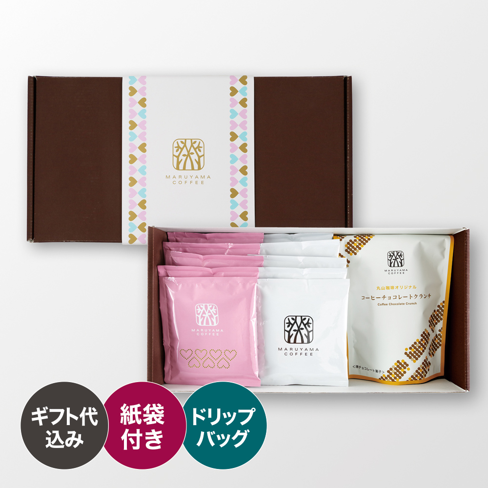 丸山珈琲のブレンドとバレンタインデー期間限定のショコラブレンドを、コーヒーチョコレートクランチと一緒にギフトにいたしました。