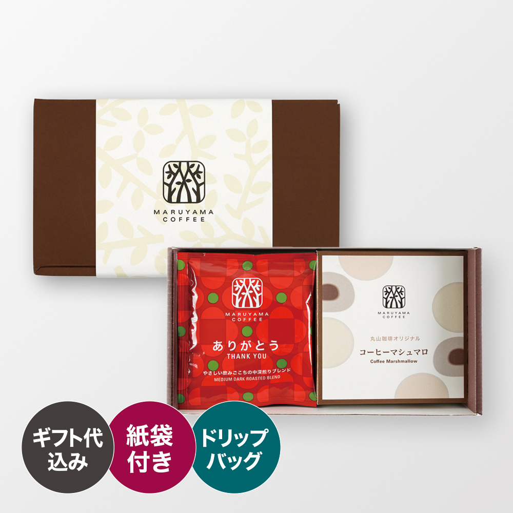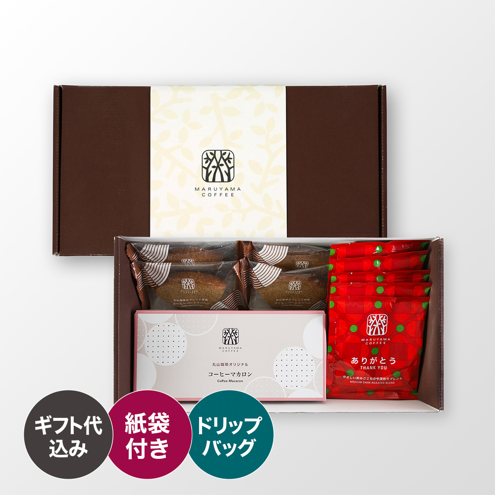 「ありがとう」の気持ちを伝えるドリップバッグのセット。コーヒー風味のマカロンとバームクーヘンの詰め合わせです。