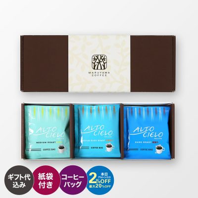 丸山珈琲の新ブランド「アルトシエロ」の焙煎度違いのブレンド3種類を詰め合わせました。「ゆったりとした時間の流れの中でおいしいコーヒーを召し上がってほしい」という想いを込めたギフトです。専用ギフト箱でのご用意です。
